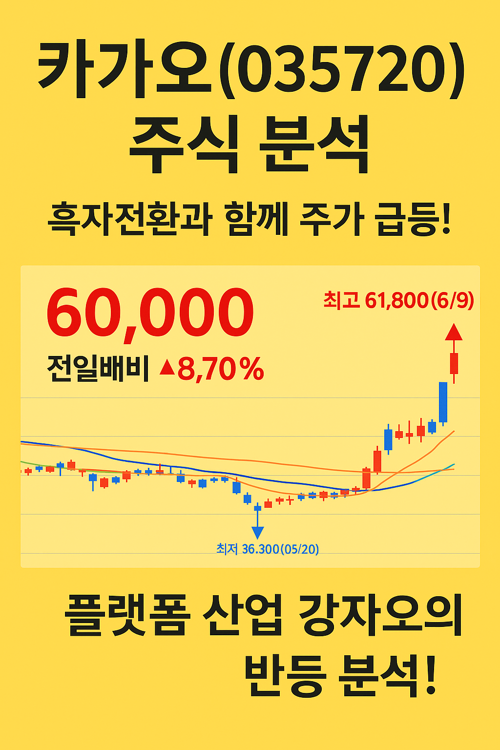카카오는 플랫폼과 콘텐츠 경쟁력을 기반으로 흑자 전환 및 이익 회복 구간에 진입했습니다. 단기 과열과 높은 밸류에이션은 유의하되, 장기적 투자 가치가 충분한 성장주로 판단
